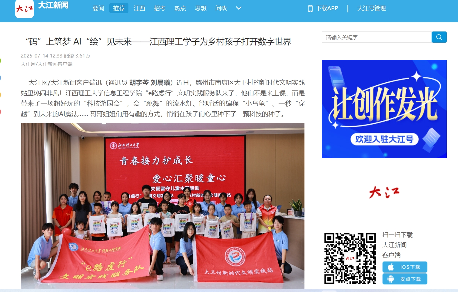 此次“e路虔行”文明实践活动,是安博站官网登录入口,_安博(中国)信息工程学院学子们走出校园、服务乡村的温暖实践。他们用自己学的专业知识,变着花样给村里的孩子们打开科技新世界的大门。这不仅仅是一次活动,更是为乡村的未来,悄悄点亮了一盏盏希望的灯。实践队将高校育人成果转化为服务社会的动能,为缩小城乡数字鸿沟、推动教育公平与乡村振兴贡献专业力量。