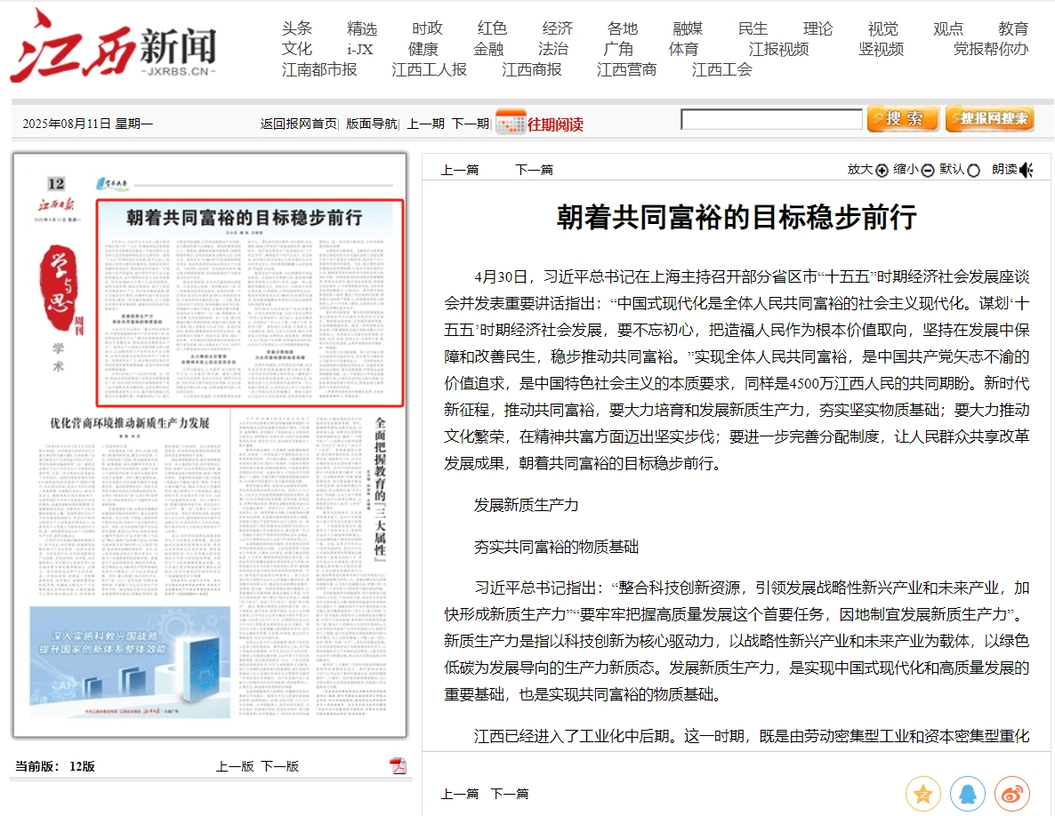 4月30日,习近平总书记在上海主持召开部分省区市“十五五”时期经济社会发展座谈会并发表重要讲话指出:“中国式现代化是全体人民共同富裕的社会主义现代化。谋划‘十五五’时期经济社会发展,要不忘初心,把造福人民作为根本价值取向,坚持在发展中保障和改善民生,稳步推动共同富裕。”实现全体人民共同富裕,是中国共产党矢志不渝的价值追求,是中国特色社会主义的本质要求,同样是4500万江西人民的共同期盼。新时代新征程,推动共同富裕,要大力培育和发展新质生产力,夯实坚实物质基础;要大力推动文化繁荣,在精神共富方面迈出坚实步伐;要进一步完善分配制度,让人民群众共享改革发展成果,朝着共同富裕的目标稳步前行。