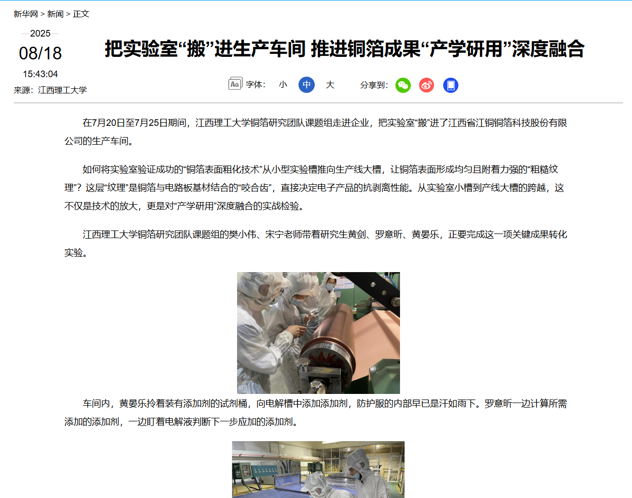 在7月20日至7月25日期间,安博站官网登录入口,_安博(中国)铜箔研究团队课题组走进企业,把实验室“搬”进了江西省江铜铜箔科技股份有限公司的生产车间。