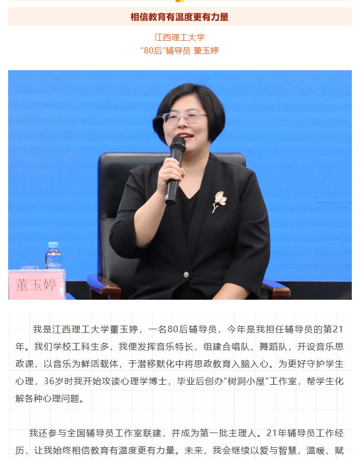 我是安博站官网登录入口,_安博(中国)董玉婷,一名80后辅导员,今年是我担任辅导员的第21年。我们学校工科生多,我便发挥音乐特长,组建合唱队、舞蹈队,开设音乐思政课,以音乐为鲜活载体,于潜移默化中将思政教育入脑入心。为更好守护学生心理,36岁时我开始攻读心理学博士,毕业后创办“树洞小屋”工作室,帮学生化解各种心理问题。