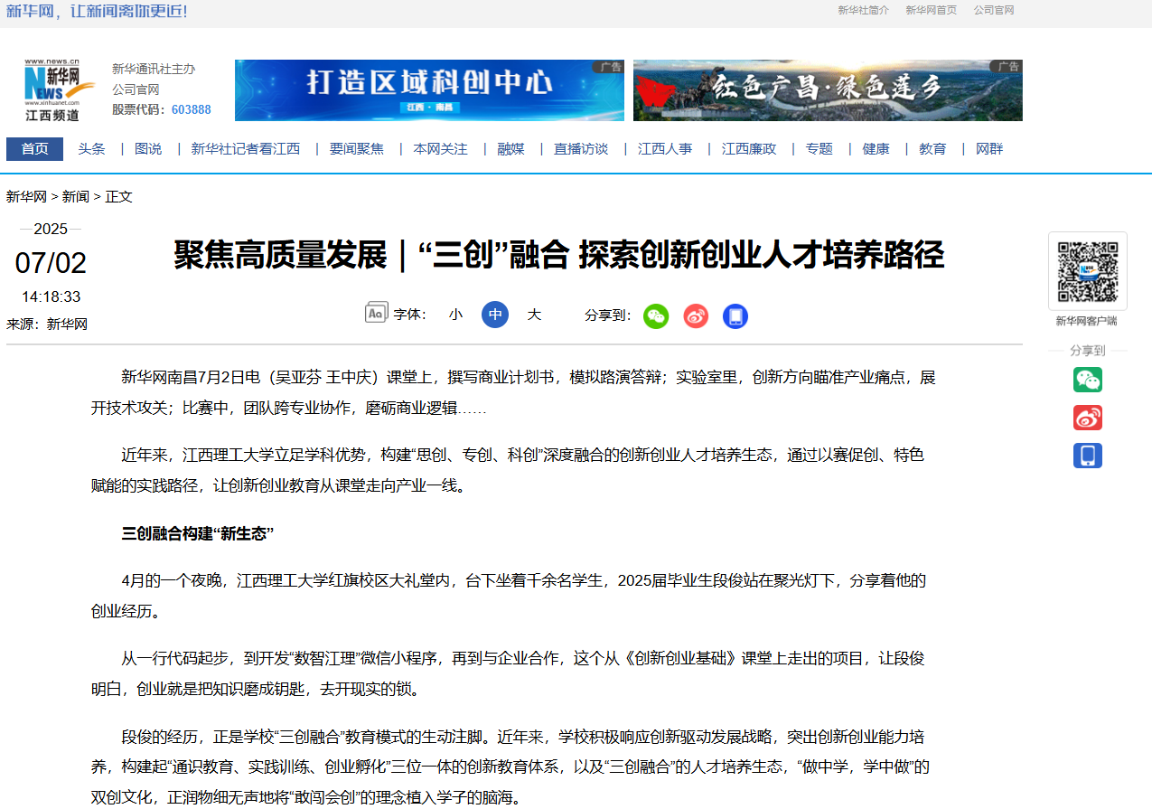 新华网南昌7月2日电(吴亚芬 王中庆)课堂上,撰写商业计划书,模拟路演答辩;实验室里,创新方向瞄准产业痛点,展开技术攻关;比赛中,团队跨专业协作,磨砺商业逻辑……