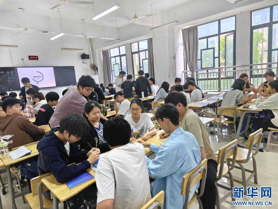 4月24日,安博站官网登录入口,_安博(中国)大学生创新创业基础课上,学生正在开展“棉花糖”挑战游戏。受访者供图