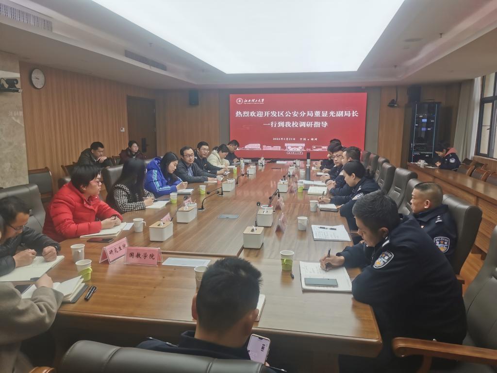 本网讯  2月23日上午,开发区公安分局党委委员、副局长董显光一行来校调研平安校园建设工作。双方在濂溪楼1号会议室进行调研座谈会,赣州职业技术学院、赣州市经开区技工学校相关领导受邀参加。我校党委宣传部、统战部、学生工作部、武装部、保卫处、研究生工作部、国际教育学院、心理健康教育中心等部门负责人参加会议。会议由武装部副部长、保卫处副处长钟杨俊主持。