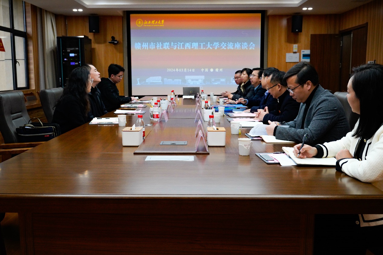 本网讯  3月14日下午,赣州市社联郑成功主席一行来访我校。校党委常委、副校长黄志繁在三江校区濂溪楼3号会议室会见来宾并开展座谈交流。学校社会科学处全体人员,马克思主义学院、外国语学院、应急管理与安全工程学院、体育与艺术学院分管科研工作的院领导及建筑与设计学院青年博士代表参加会议。座谈会由校社会科学处处长王小元主持。