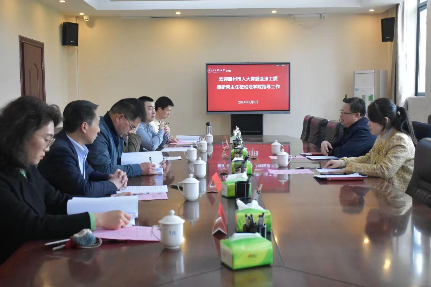 本网讯  近日,赣州市人大常委会法工委主任黄新荣莅临赣州地方立法研究基地指导工作。法学院院长项波、副院长孟春阳及学院相关教师参加座谈,会议由法学院副院长张奇主持。