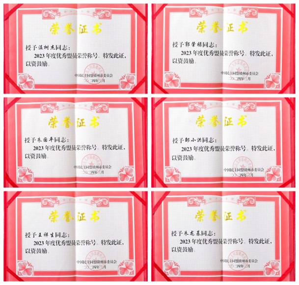 会议表彰了2023年度盟务工作先进集体、社情民意信息工作先进个人以及优秀盟员。我校民盟基层委员会荣获2023年度先进基层组织,温树杰、邹小洪、朱国平、朱龙基、王祥生、郭肇禄等盟员教师获评2023年度优秀盟员荣誉称号。