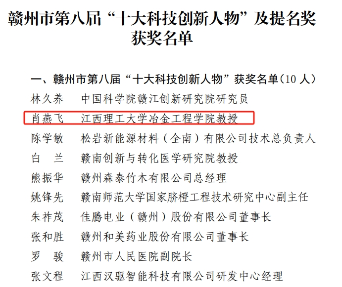 本网讯  5月2日,赣州市第八届“十大科技创新人物”及提名奖入围人选公示结束,我校冶金工程学院肖燕飞教授荣获赣州市第八届“十大科技创新人物”称号。