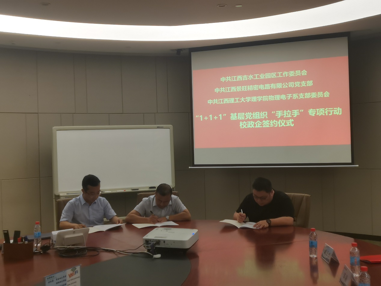 本网讯  5月14日,我校理学院物理电子系党支部联合吉水工业园区党工委、江西景旺精密电路有限公司党支部开展“1+1+1”基层党组织“手拉手”专项行动暨校政企合作专项行动。理学院党委书记周茂平、理学院院长徐中辉、理学院党委副书记钟晓辉等人参加活动。