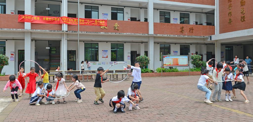 捐赠仪式结束后,民进会员带领同学们做起了“桃花朵朵开”“鱼跃龙门”等丰富有趣的游戏。