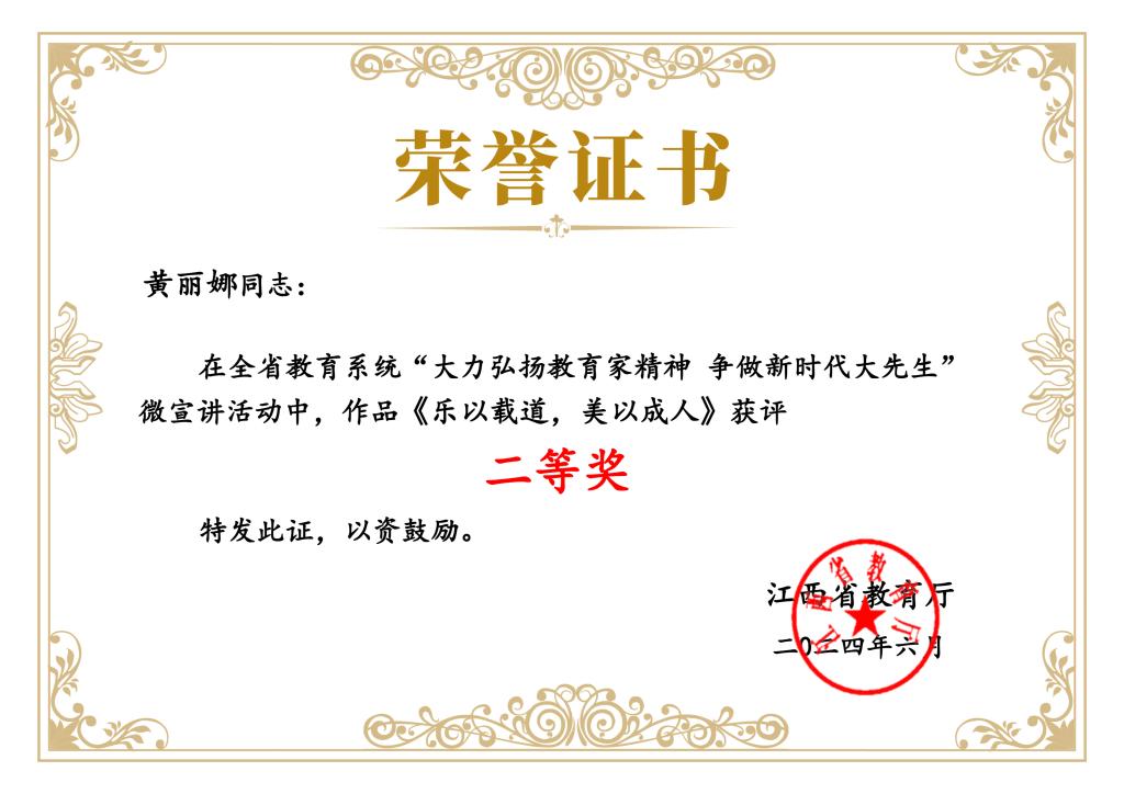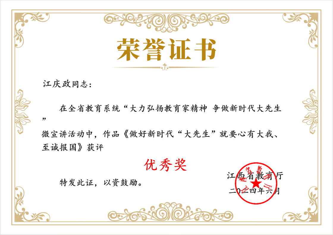 本网讯 近日,由省委教育工委组织的全省教育系统“大力弘扬教育家精神,争做新时代大先生”微宣讲视频征集活动获奖名单揭晓,我校体育与艺术学院教师黄丽娜的作品《乐以载道,美以成人》荣获二等奖,稀土学院教师江庆政的作品《做好时代“大先生”就要心有大我,至诚报国》荣获优秀奖。两个作品生动展示了我校教师在教育教学过程中的创新实践,体现了我校教师对教育家精神的深刻理解和实践追求。
