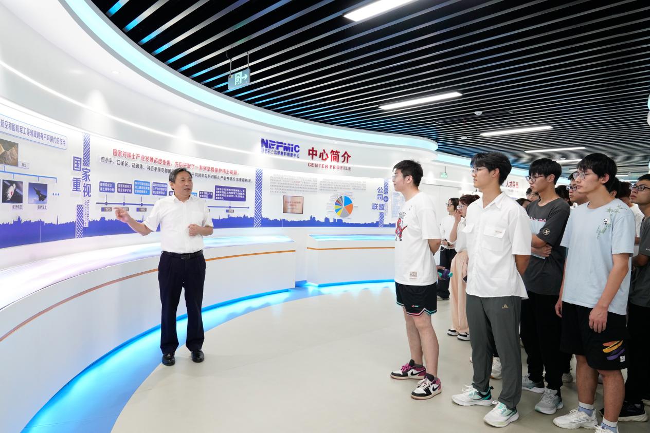 同学们怀着满腔热情,乘坐大巴抵达国家稀土功能材料创新中心。尽管夏日炎炎,但大家的求知欲却丝毫不减。在罗仙平的带领下,同学们首先踏入了科技氛围浓厚的“S”型长廊。长廊两侧的展板,详尽展示了稀土功能材料在多个领域的广泛应用及其重要性,罗仙平逐一解读,深入浅出地讲解了创新中心的组建过程、专家成员、稀土的分布及种类以及中心的科研成果等内容。同学们听得如痴如醉,对稀土科技的魅力与力量有了更为直观的认识。