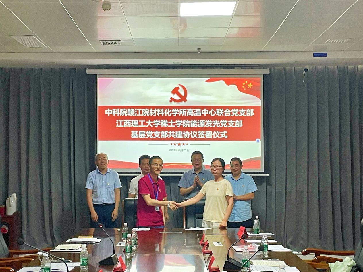 本网讯 6月21日,我校稀土学院能源发光党支部与中国科学院赣江创新研究院材料化学所高温中心联合党支部联合结对共建开展主题党日活动,中国科学院赣江创新研究院党委委员、副院长廖伍平,我校党委常委、副校长熊志华,稀土学院党委副书记(主持工作)吴子平,赣江院材料化学所常务副所长、支部书记杨向光以及双方党支部全体党员参加活动。