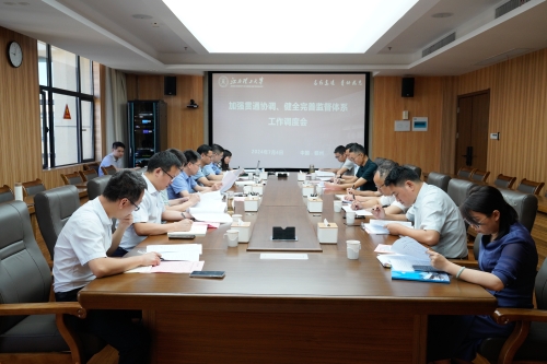 本网讯  7月4日上午,我校召开加强纪检监察监督与组织、人事、督评、财会、审计等职能监督贯通协调、健全完善监督体系工作调度会。校党委常委、纪委书记、监察专员刘飞,校党委常委、组织部部长刘志刚、宣传部部长盛晓明出席会议,相关职能部门负责人参加会议。