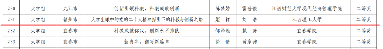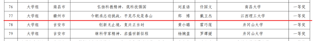 经学校遴选推荐,省委教育工委、省教育厅线上、线下评审,我校学生作品《今朝承志迎挑战,平芜尽处是春山》(郑博,指导老师:戴卫杰)荣获一等奖,《大学生眼中的党的二十大精神指引下的科教与创新之路》(姬祥,指导老师:刘浩)荣获二等奖,《科学引领青春,青春铸就时代》(曹丽敏,指导老师:赵金凡)、《初心如磐终不移,砥砺奋进创新高》(董龙欣,指导老师:郭晟)、《盛世之言》(吴俊霖,指导老师:赖晓花)荣获三等奖。