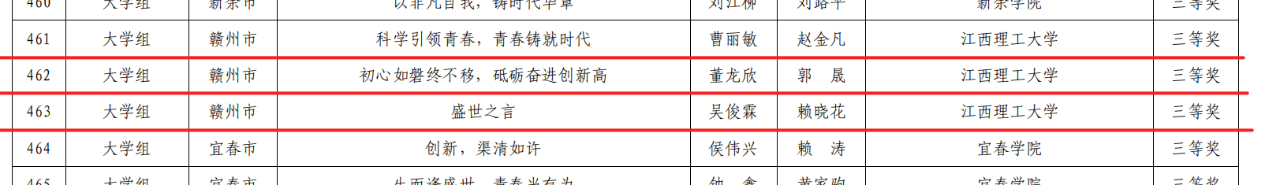 本网讯  近日,江西省教育厅公布了2023年“非凡成就铸辉煌 踔厉奋发担使命”主题读书活动获奖名单。我校5名学子的征文作品获奖,其中一等奖1名,二等奖1名,三等奖3名。