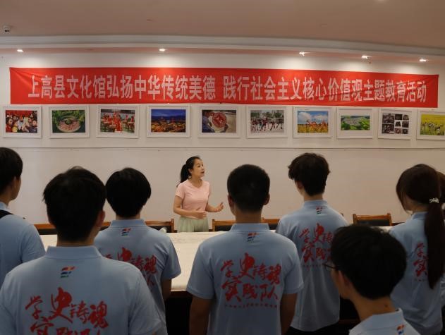 7月9日,实践队奔赴上高县文化馆与文明实践中心开展非遗文化学习活动。活动过程中,上高县文化馆馆长晏国莲为队员们详细介绍了该县在地方特色文化发展、中华文化赓续传承、丰富人民精神文化生活等方面的基本概况,并带领队员们前往上高县“非遗”展厅参观学习。期间,实践队员们围绕上高县非遗文化“何以传承”“以何传承”与“如何传承”等理论和实践问题,对晏国莲进行专题采访并开展小组研讨交流。