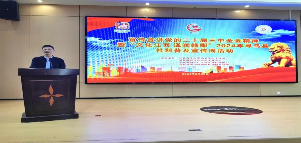 本网讯 为深入学习贯彻党的二十届三中全会精神,9月25日上午,由我校马克思主义学院、寻乌县哲学社会科学联合会、寻乌县新时代文明实践促进中心联合主办,长宁镇新时代文明实践所承办的宣传宣讲党的二十届三中全会精神暨“文化江西 泽润赣鄱”2024年寻乌县社科普及宣传周活动在长宁镇三二五文化客厅正式开启。