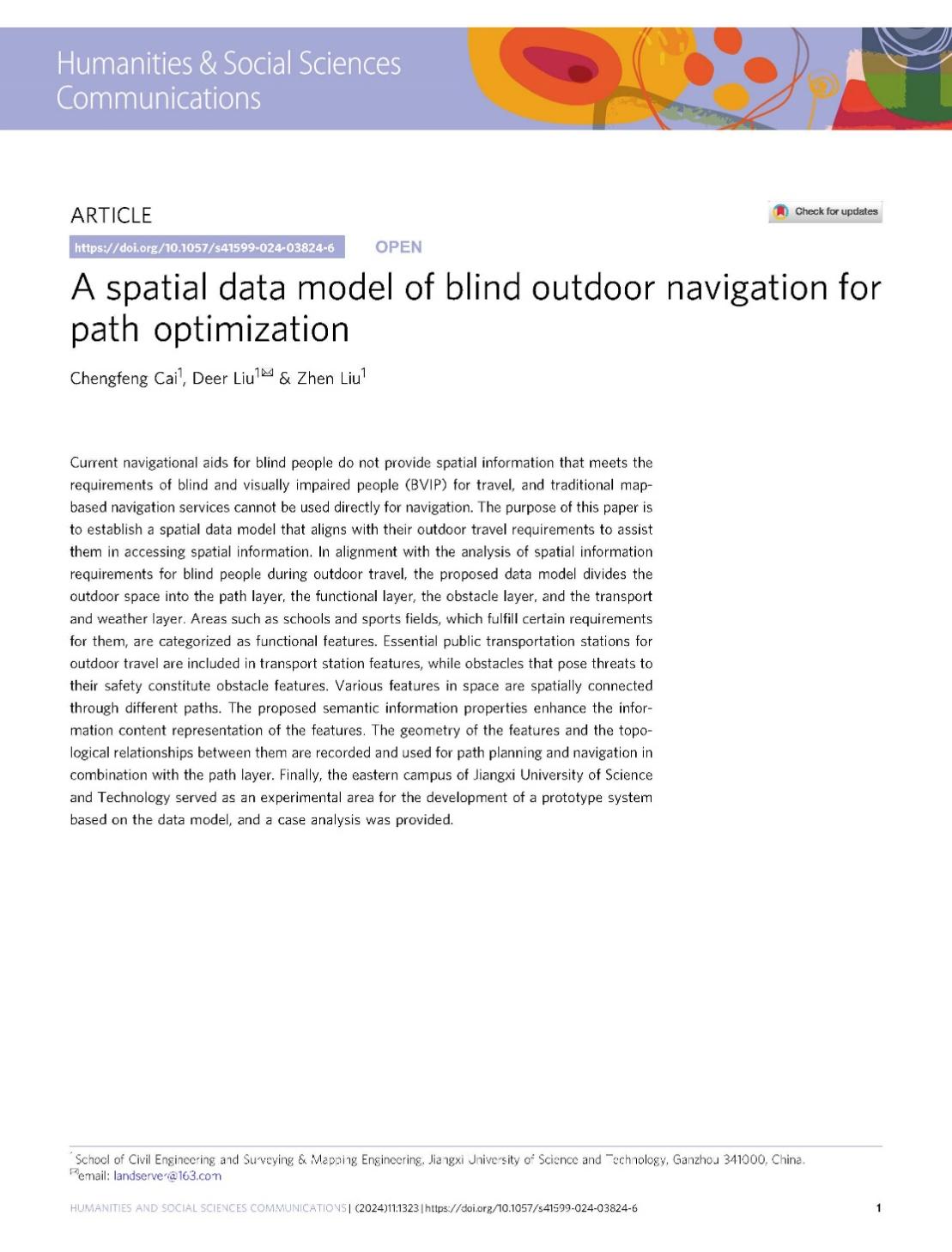 本网讯 近日,我校土木与测绘工程学院刘德儿教授团队以我校作为独立完成单位,在Nature旗下人文社科子刊《Humanities & Social Sciences Communications》发表了题为“A spatial data model of blind outdoor navigation for path optimization”(一种面向路径优化的盲人户外导航空间数据模型)的研究成果,该研究旨在为盲人导航领域提供一种全局导盲数据范式和数据底座开发途径及应用模式。