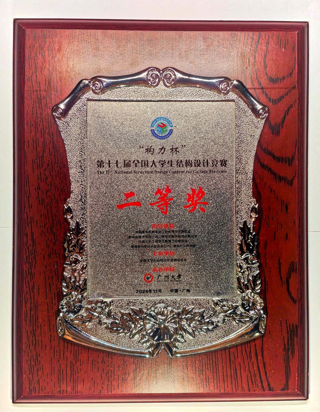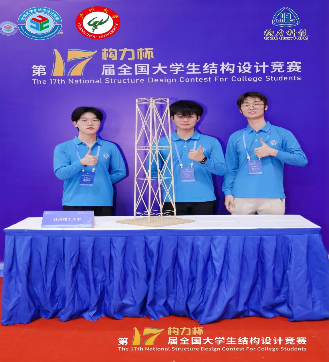 本网讯 11月7至10日,“构力杯”第十七届全国大学生结构设计竞赛在广州大学举行。我校土木工程专业2022级本科生赵宇飞、刘杰、戴昌明所在团队,在吴建奇副教授、王月梅副教授的指导下,荣获二等奖。