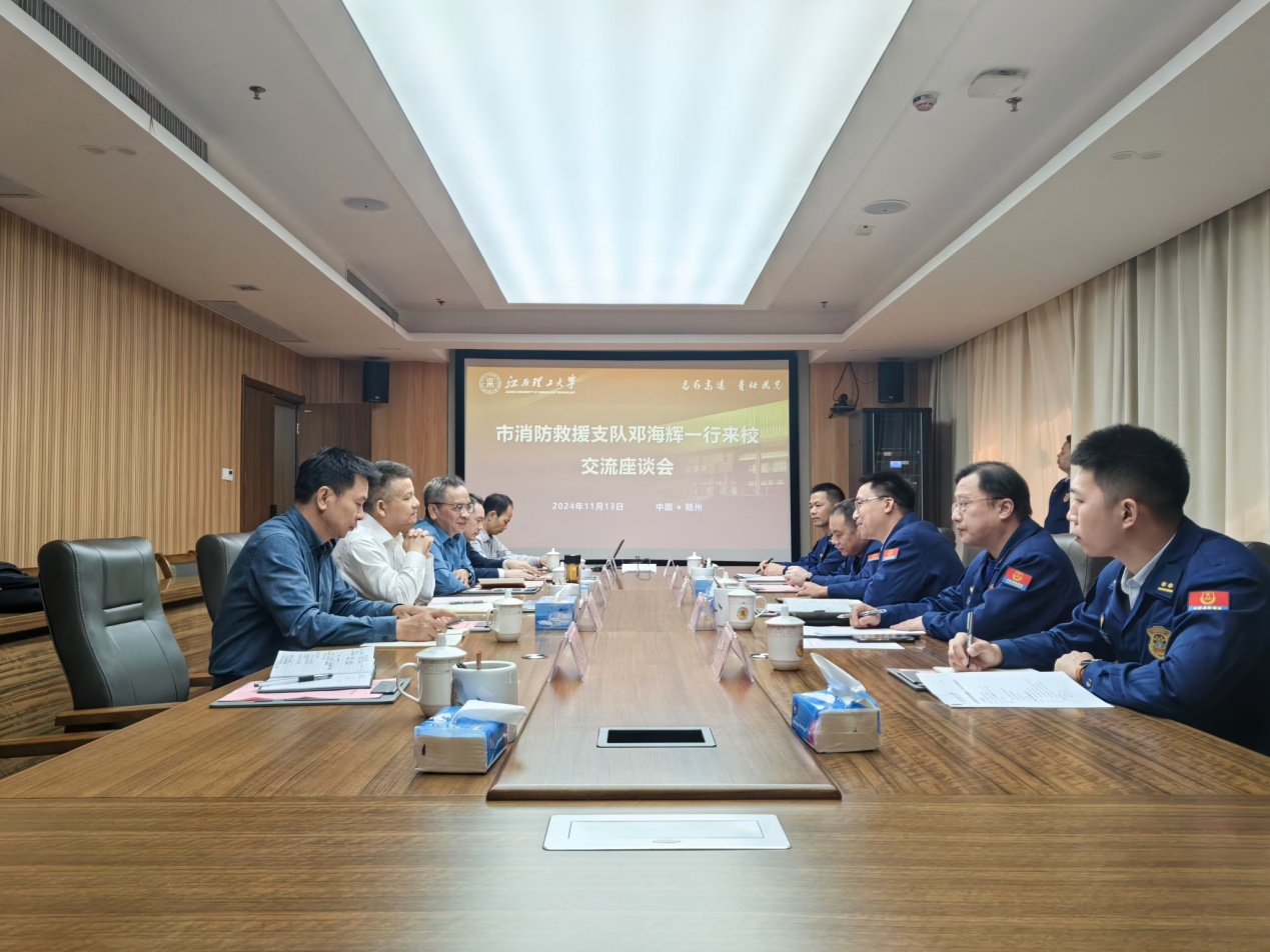 本网讯 11月13日,赣州市消防救援支队支队长邓海辉一行来校交流,共商校地合作事宜。校党委常委、副校长董冰岩出席座谈交流。应急管理与安全工程学院、校教务处、基建与后勤处等部门负责人参加座谈。