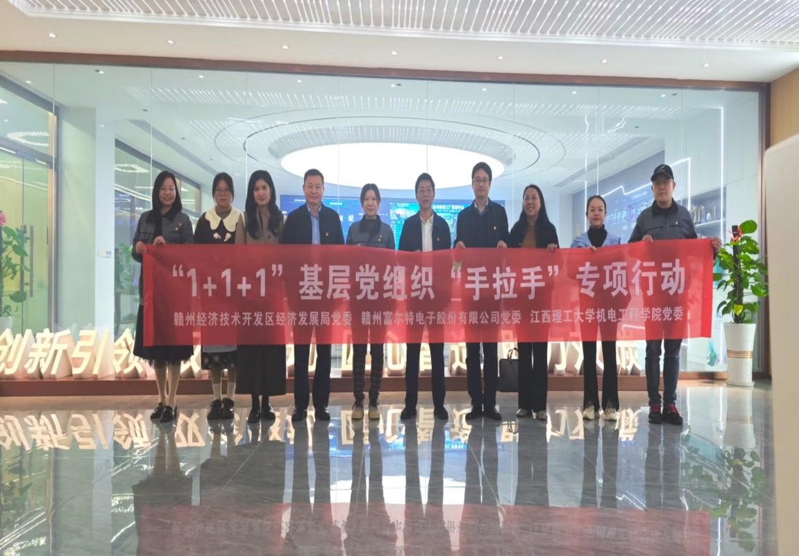 本网讯 11月20日,我校机电工程学院机械设计党支部与赣州经济技术开发区经济发展局党支部、赣州富尔特电子股份有限公司党支部共同签订《“1+1+1”基层党支部共建协议》,并联合开展主题党日活动。