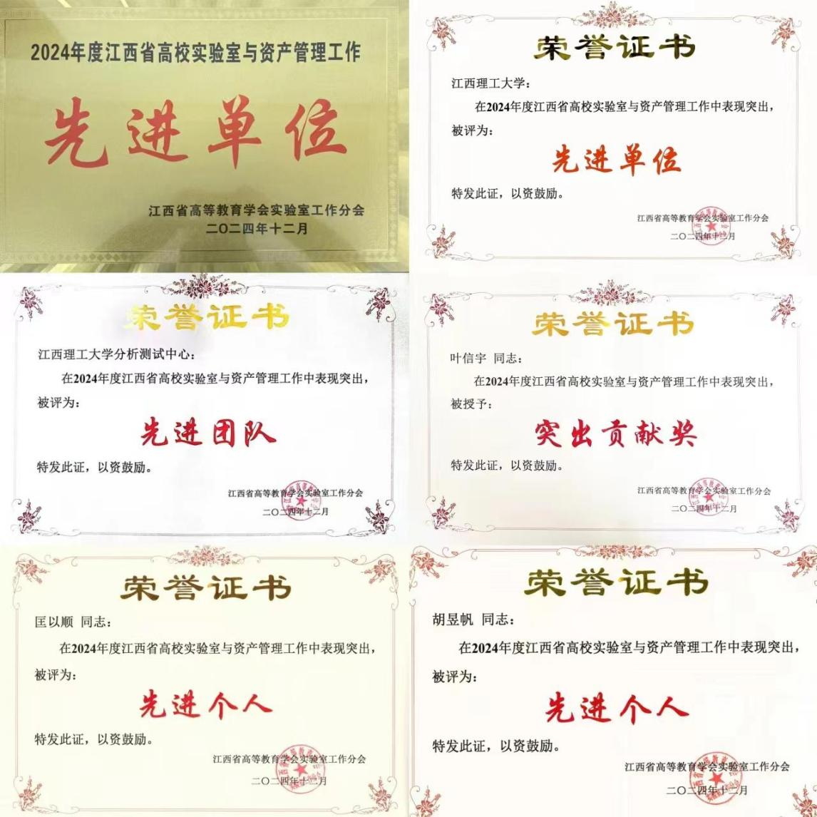 本网讯  12月13日至15日,江西省高等教育学会实验室工作分会2024年学术年会在南昌市举办。年会公布了2024年江西省高校实验室与资产管理工作先进评选结果,我校荣获“先进单位”,分析测试中心荣获“先进团队”,机电工程学院匡以顺、能源与机械工程学院胡昱帆2位老师获评“先进个人”称号,分析测试中心主任叶信宇荣获“突出贡献奖”。