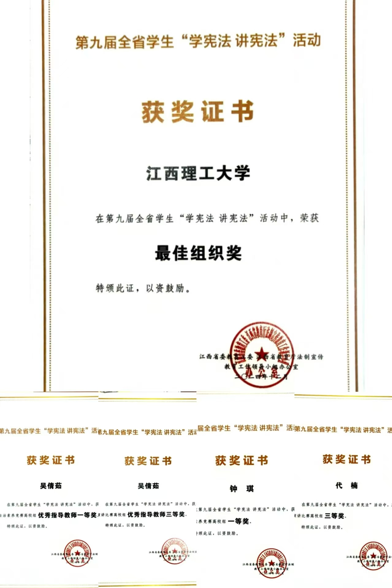 本网讯  近日,江西省委教育工委、江西省教育厅法制宣传工作领导小组办公室下发了《关于公布第九届全省学生“学宪法 讲宪法”活动获奖名单的通知》,我校获评第九届全省学生“学宪法 讲宪法”活动最佳组织奖。同时,我校法学院学子钟琪荣获法治素养竞赛一等奖、代楠荣获演讲比赛三等奖,法学院吴倩茹老师获优秀指导教师一等奖、三等奖各一项。
