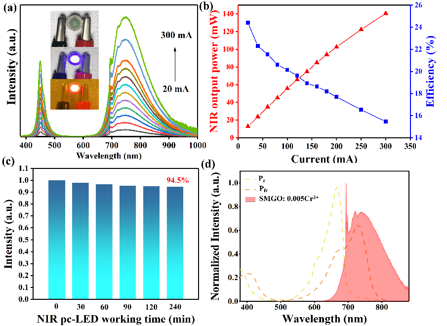 结合SMGO: 0.005Cr3+荧光粉和445 nm蓝光LED芯片制备了近红外pc-LED,在300 mA下近红外输出功率为140.5 mW,光电转换效率为15.5%。