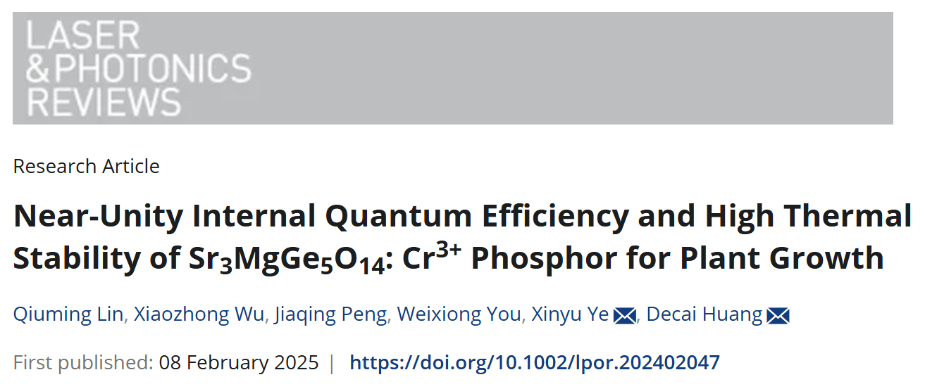 本网讯 近日,我校稀土学院稀土发光材料及器件研究所叶信宇教授和黄得财副研究员在稀土发光材料领域取得重要研究成果,成果以“Near-Unity Internal Quantum Efficiency and High Thermal Stability of Sr3MgGe5O14: Cr3+ Phosphor for Plant Growth”为题公开发表在光学领域权威期刊《Laser & Photonics Reviews》(一区Top,影响因子9.8)。论文第一作者为2022级博士研究生林秋明,通讯作者为叶信宇教授和黄得财副研究员。