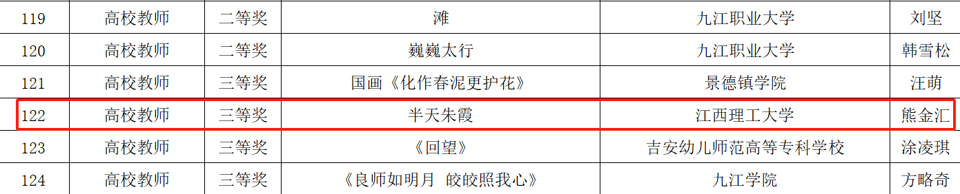 本网讯  近日,江西省教育厅、江西省文学艺术界联合会联合发文公布全省大中小学书画大赛获奖名单,此次大赛由校团委进行精心组织,统筹安排,我校建筑与设计学院熊金汇老师凭借水墨作品《半天朱霞》脱颖而出,荣获教师组三等奖。
