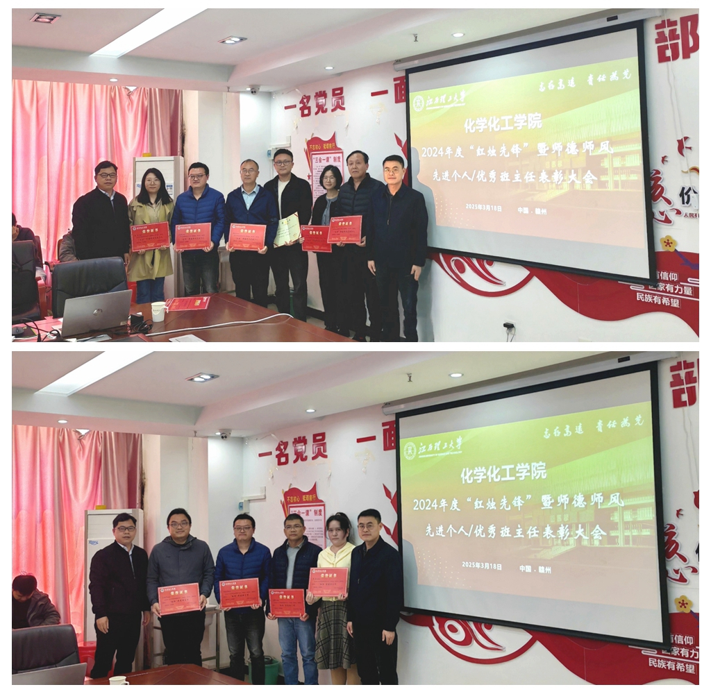 本网讯 为弘扬新时代教师风尚,深化师德师风建设,3月18日,我校化学化工学院在稀土大楼B624召开2024年度“红烛先锋”暨师德师风先进个人、优秀班主任表彰大会。学院领导班子及全体教职工参加会议。会议由学院党委副书记舒庆主持。