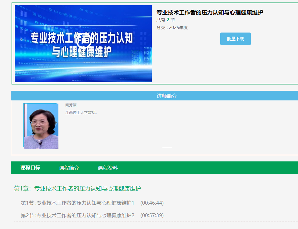 本网讯  近日,国家专业技术人才知识更新工程指导协调小组办公室公布了2025年专业技术人员公需科目共享课件名单(共35项),由我校继续教育学院、教育培训中心运管的国家级专业技术人员继续教育基地报送的《专业技术工作者的压力认知与心理健康维护》(讲座教师:秦秀清教授)成功入选(江西省唯一一项)。
