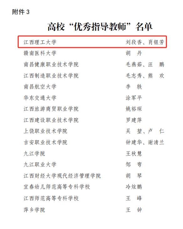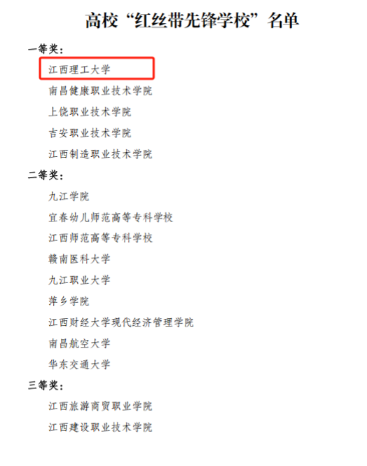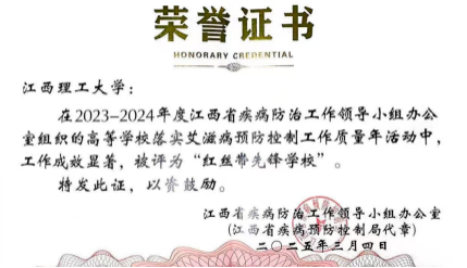 本网讯 近期,江西省疾病防治工作领导⼩组办公室公布了2023-2024年度江西省高等学校落实艾滋病预防控制工作质量年活动评选结果。我校荣获“红丝带先锋学校”称号,刘段香、肖银芳两位教师获评“优秀指导教师”,位列江西省高校榜首。