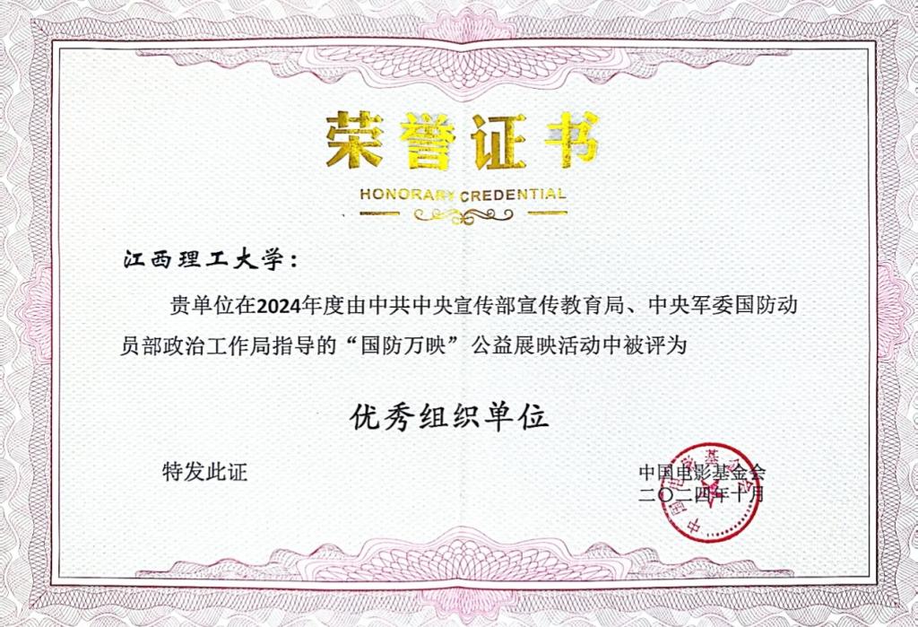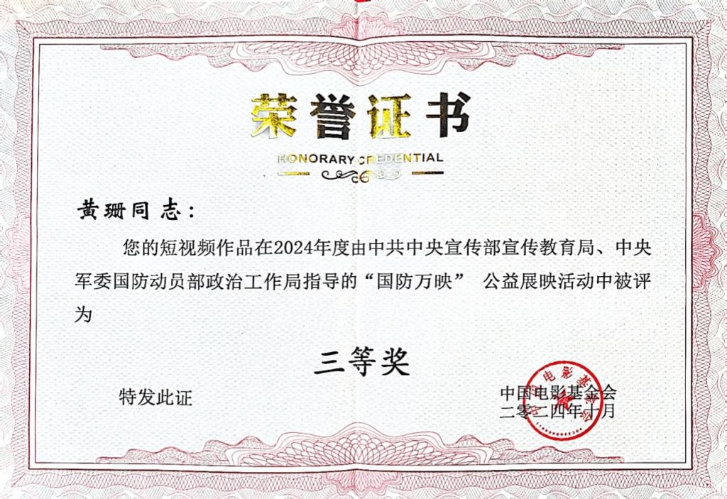 本网讯 近日,由中共中央宣传部宣传教育局、中央军委国防动员部政治工作局指导的2024年度“国防万映”公益展映活动评选结果揭晓,我校荣获“优秀组织单位”称号,商学院黄珊同学的短视频作品《史鉴辉煌路》荣获全国三等奖。