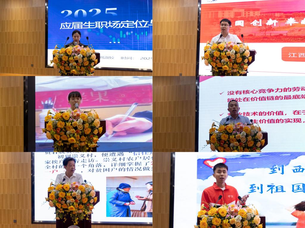活动中,壹马当先(江西)经济技术合作有限公司合伙人刘淑姣,我校冶金工程学院副院长肖燕飞,江西省南昌市东湖区彭家桥街道光明社区党委副书记、团委书记徐玫玫以及赣州南冶勘测设计有限公司董事长邬雪江,我校驻兴国县崇贤乡贺堂村第一书记兼工作队队长许立新、西部计划志愿者涂浩宇六位嘉宾分别以亲身经历从就业形势洞察、科技创新引领、基层服务实践、民营创业发展、西部计划奉献及奋斗精神传承等多元视角讲述了青年在基层沃土中拼搏奋斗、实现价值的动人故事,令在场学子深受触动。