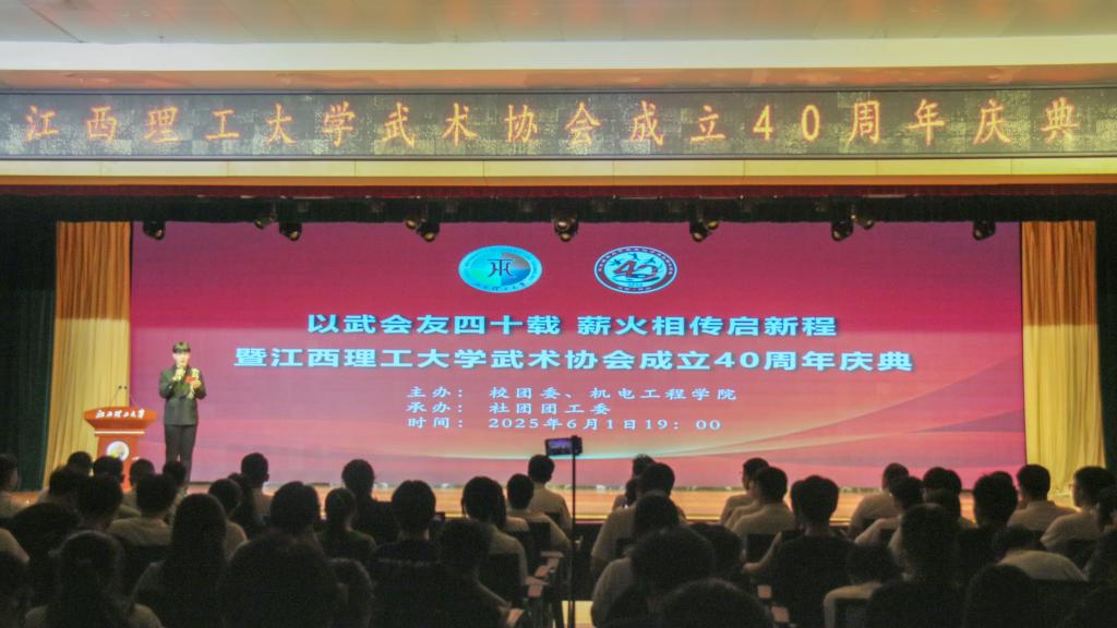 庆典伊始,主持人深情回顾了武术协会自1985年创立以来的四十年风雨历程。1985年3月,在时任江西冶金学院副院长胡奕信的关怀和校团委指导下,江金华等人创立了武术协会。协会成立之初即秉持正规化、专业化发展理念,聘请胡奕信副院长担任名誉会长,并邀请赣州市武术研究社创办人宋亦梅、冶院武术教师黎永炼等名家担任技术顾问与教练。四十年间,武术协会不断发展壮大,积极参与校园文化活动,广泛开展校际交流,培养了大批优秀会员,并在各级武术赛事中屡创佳绩,从青涩走向成熟,铸就了今日的辉煌。