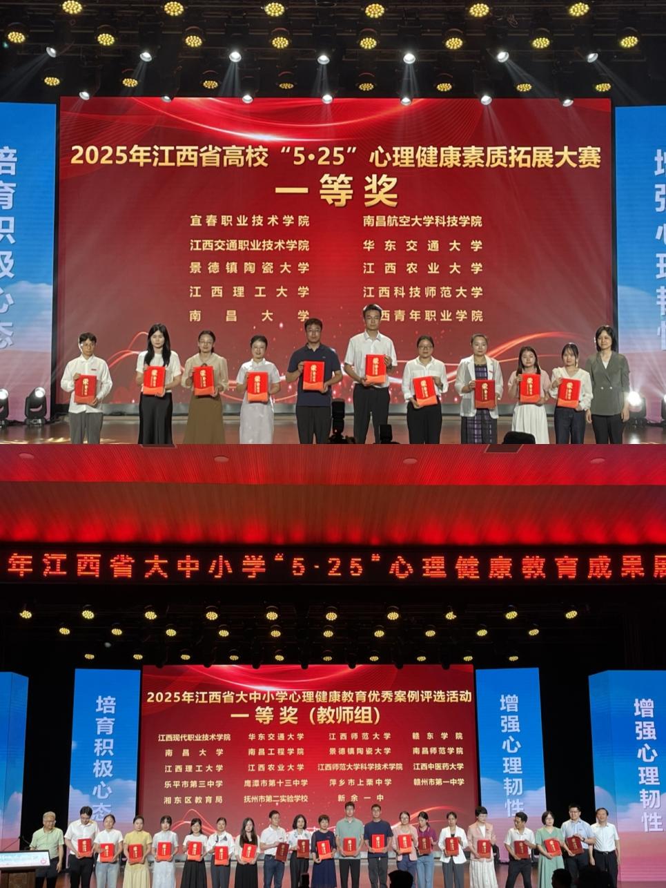 在2025年江西省高校“5・25”心理健康素质拓展大赛中,由我校体育与艺术学院学生组成的“我们超棒对不队”凭借出色的表现,从众多参赛队伍中突围,荣获一等奖;在2025年江西省大中小学心理健康教育优秀案例评选中,我校报送的案例《“六位一体”体系下的心理育人新平台——“周五夜话”直播化解大学生心理危机的探索与实践》荣获高校教师组一等奖,案例《微光“童”行,遇见曙光》获得高校学生组二等奖;在2025年江西省大中小学“5・25”心理健康主题情景剧大赛(高校组)中,我校原创心理情景剧《你很好》荣获三等奖。