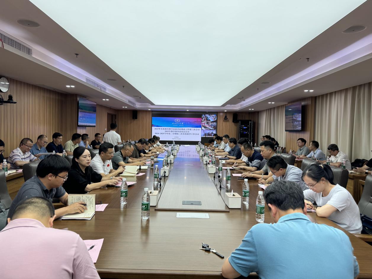 本网讯 为精简会议,高效统筹推进本科教育教学工作,6月26日下午,我校在三江校区濂溪楼2号会议室依次召开了2025年本科教育教学审核评估整改工作第三次会议、2025年教学指导委员会会议暨本学期第三次本科教学工作会议。校党委常委、副校长黄志繁出席,相关职能部门负责人、全体教指委委员、各学院分管教学工作副院长及教务处全体人员分阶段参加会议。校教务处处长潘春荣主持会议。