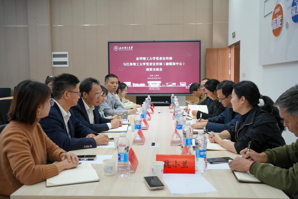 本网讯  10月23日,东华理工大学党委常委、宣传部部长刘剑斌一行来校交流。双方在三江校区融媒体中心会议室举行座谈。我校党委常委、宣传部部长盛晓明出席会议,双方宣传部相关人员参加会议。