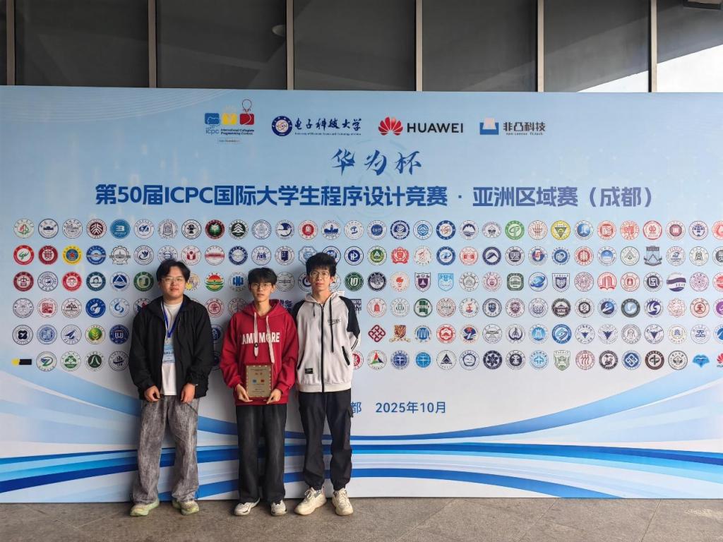 本网讯 近日,第50届ICPC国际大学生程序设计竞赛亚洲区域赛(成都站)在电子科技大学圆满落幕。本次大赛由ICPC亚洲区委员会授权、电子科技大学承办,共吸引来自清华大学、北京大学、上海交通大学、复旦大学、浙江大学、中国科学技术大学等188所高校的320支队伍同台竞技。经过激烈角逐,在信息工程学院管希东老师指导下,我校2023级计算机科学与技术3班华振峰、2023级计算机科学与技术1班钟伟及2023级电子信息科学与技术专业罗健三位同学组成的“江理1队”奋勇拼搏,最终斩获铜牌。